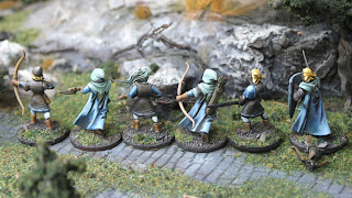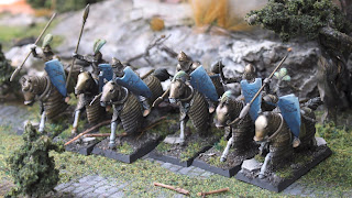And finally some knights that I kitbashed from the magnificient (really, some of the best miniatures I own) V&V Byzantine cavalry with Oathmark shields, feather plumes and speartips on steel rod spears. Byzantine armour has really elven feel. I originally was going to change the helmets for more pointy ones, but they were already quite pointy from the box, so decided to just add the feathers and I have to say I'm quite happy with the result.